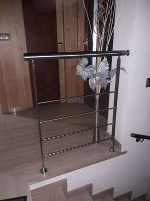 Garde-corps en acier inoxydable AISI 304 de 100 cm de hauteur, composé de main courante de 50 mm de diamètre fixée à montants verticaux de 40x40 mm et remplissage de 3 barreaux massifs horizontaux soudés aux montants, pour vide polygonal de plancher, fixé par ancrage mécanique avec chevilles en nylon et vis en acier. | ||