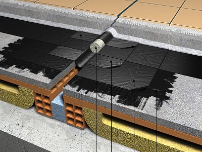 Joint de dilatation en toiture terrasse froide, accessible. Imperméabilisation avec des membranes bitumineuses