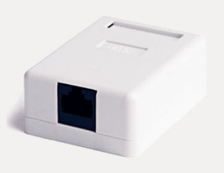 Prise de surface de fin de réseau de dispersion constituée de connecteur femelle type RJ-45 de 8 contacts, catégorie 6 et boîte en saillie, de 47x64,5x25,2 mm, couleur blanche. | ||